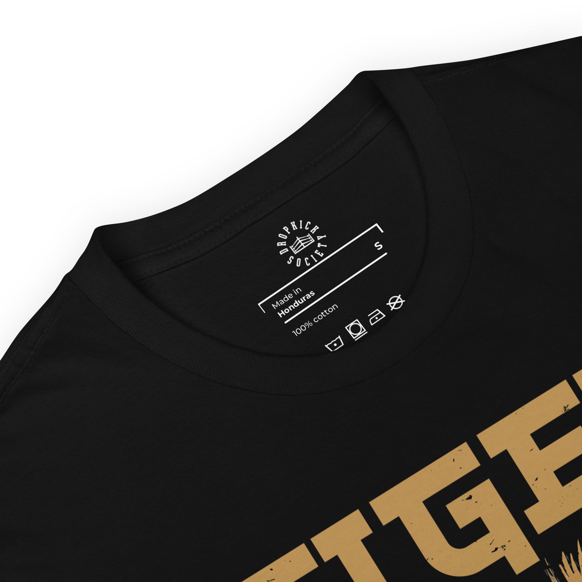 Dominant Front Graphic: Sharp golden typography and intense tiger eyes set against a solid black tee—clean, bold, and unmissable.
